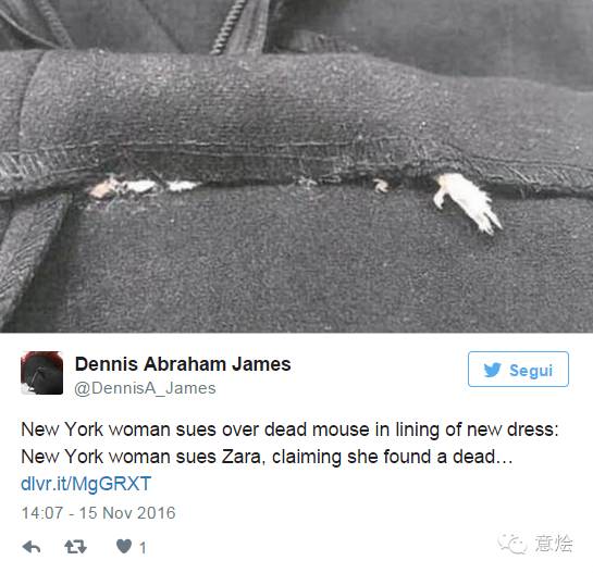 据意大利《日报》11月15日消息,《纽约邮报》(New York Post)首先报道了女孩的遭遇,短短几个小时之内,世界上的媒体都开始纷纷报道这一事件。女孩表示,她在买了这件减价的衣服,在把衣服穿上之后,就感觉到有些不对劲。先是闻到了有一股刺鼻的,一种让人想吐的味道。之后,便在衣领的缝纫处发现了老鼠的爪子.....