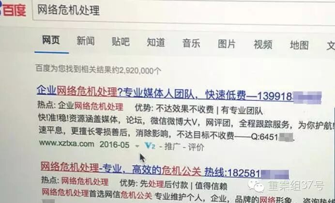 重案组37号探员5月2日晚搜索“网络危机处理”,得到5条推广链接。探员致电其中两个网站留的手机号,对方均称可以删除百度贴吧的帖子。其中一家称,现在属于敏感时期,删除一条百度贴吧医疗类的帖子收费要几千元。而另一家则表示仅需700元就能删除。