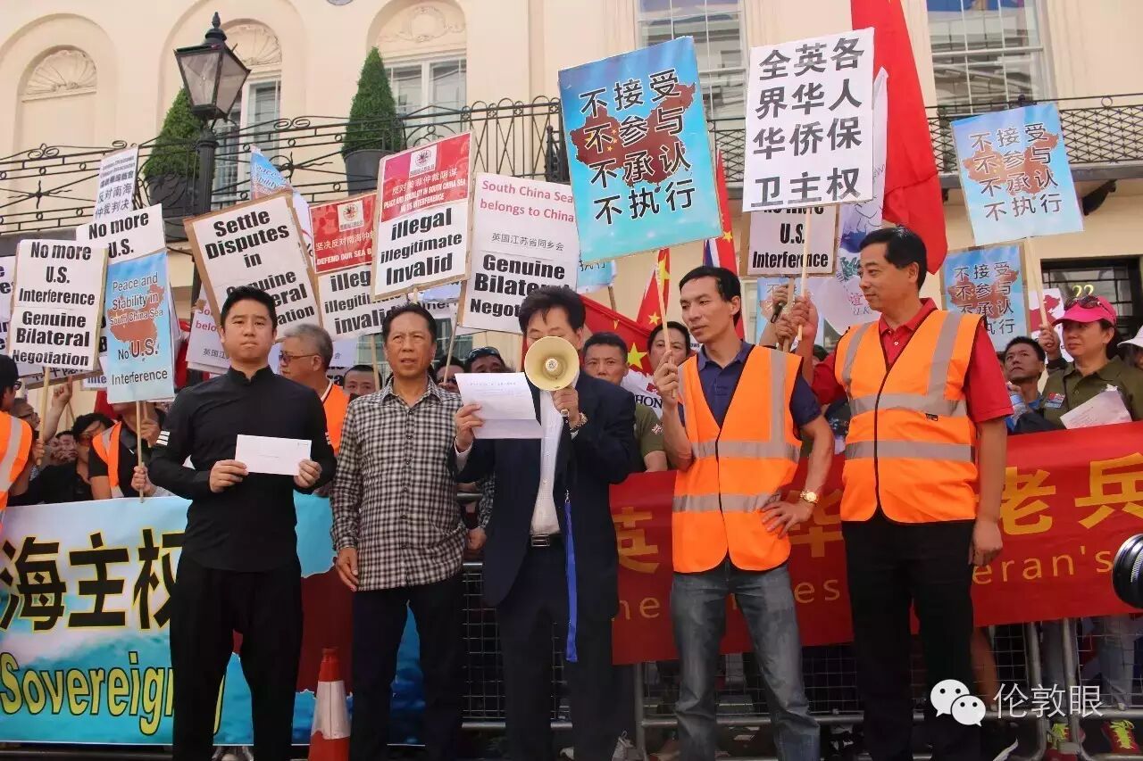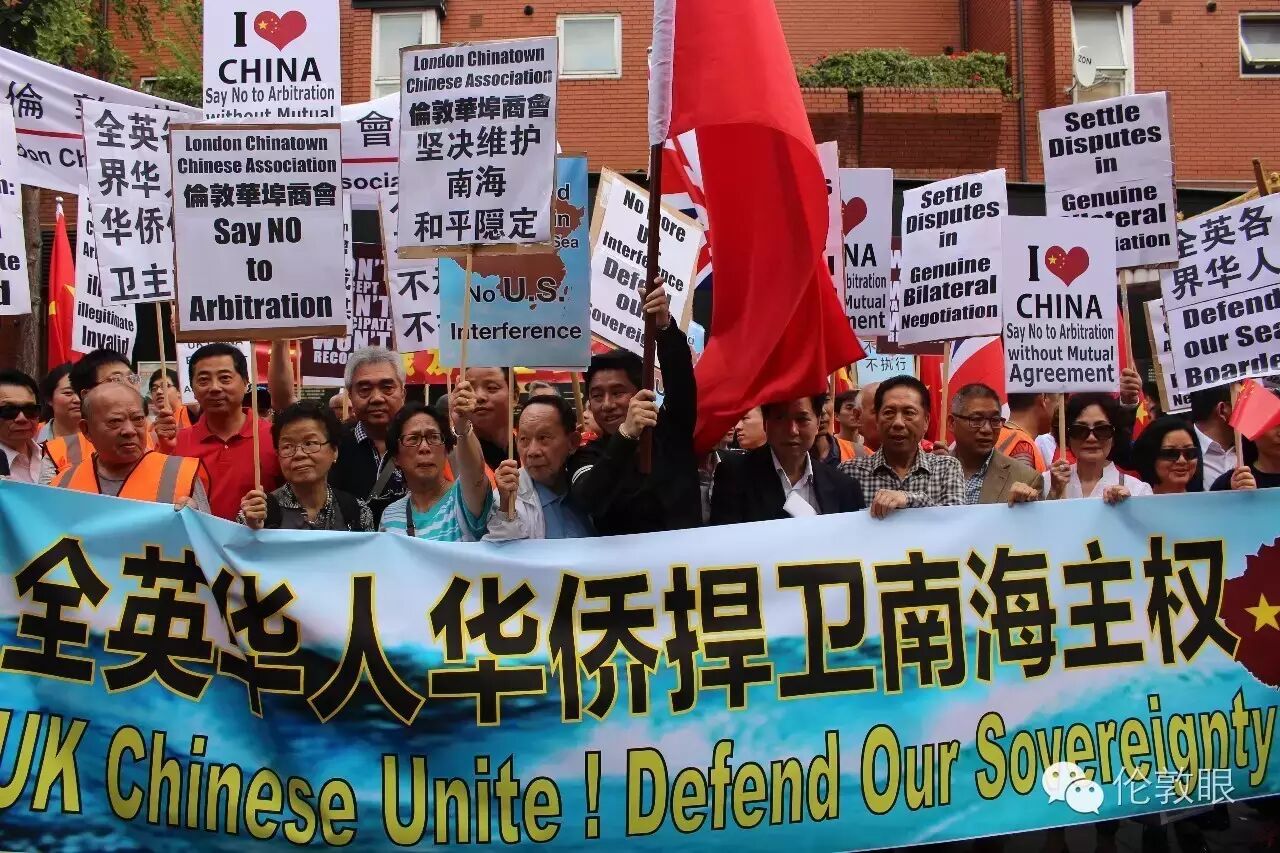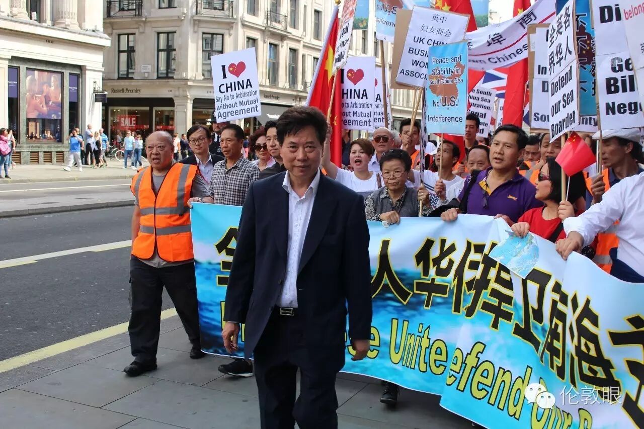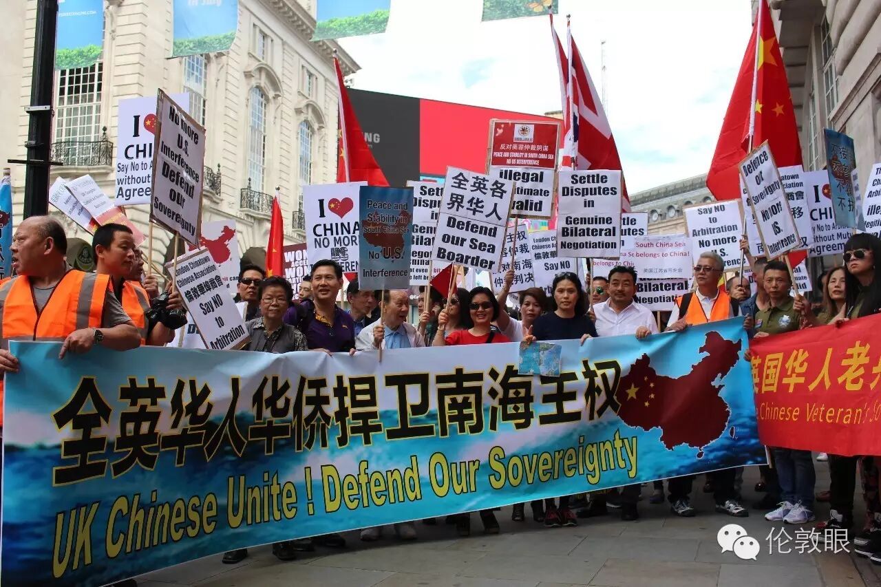 7月16日下午,为了抗议海牙仲裁庭的非法仲裁和捍卫中国在南海的固有主权,伦敦华埠商会组织英国50多个华人社团发起示威游行。