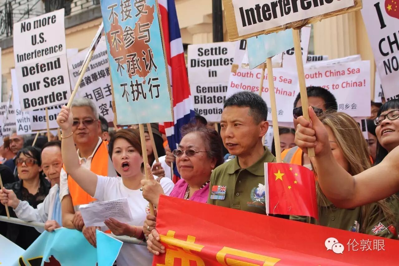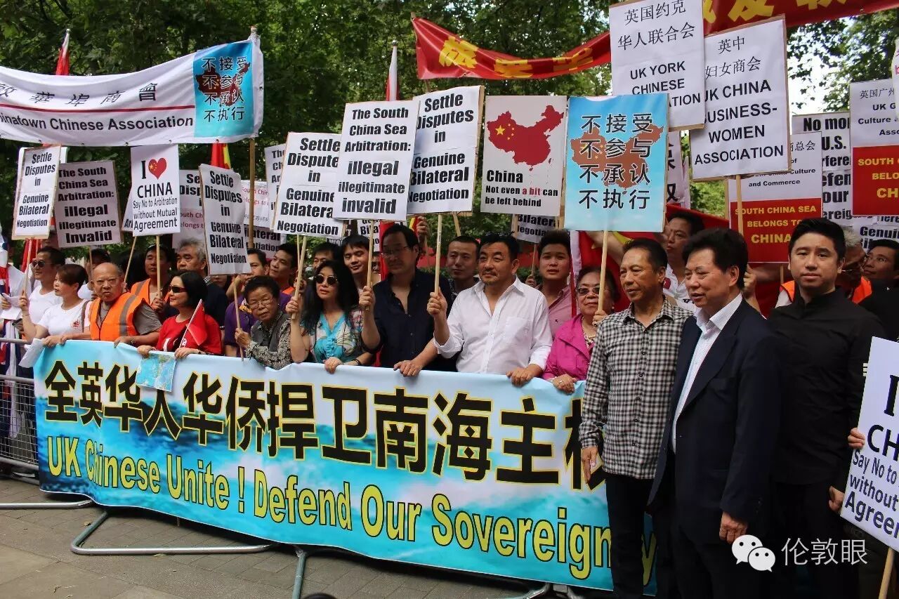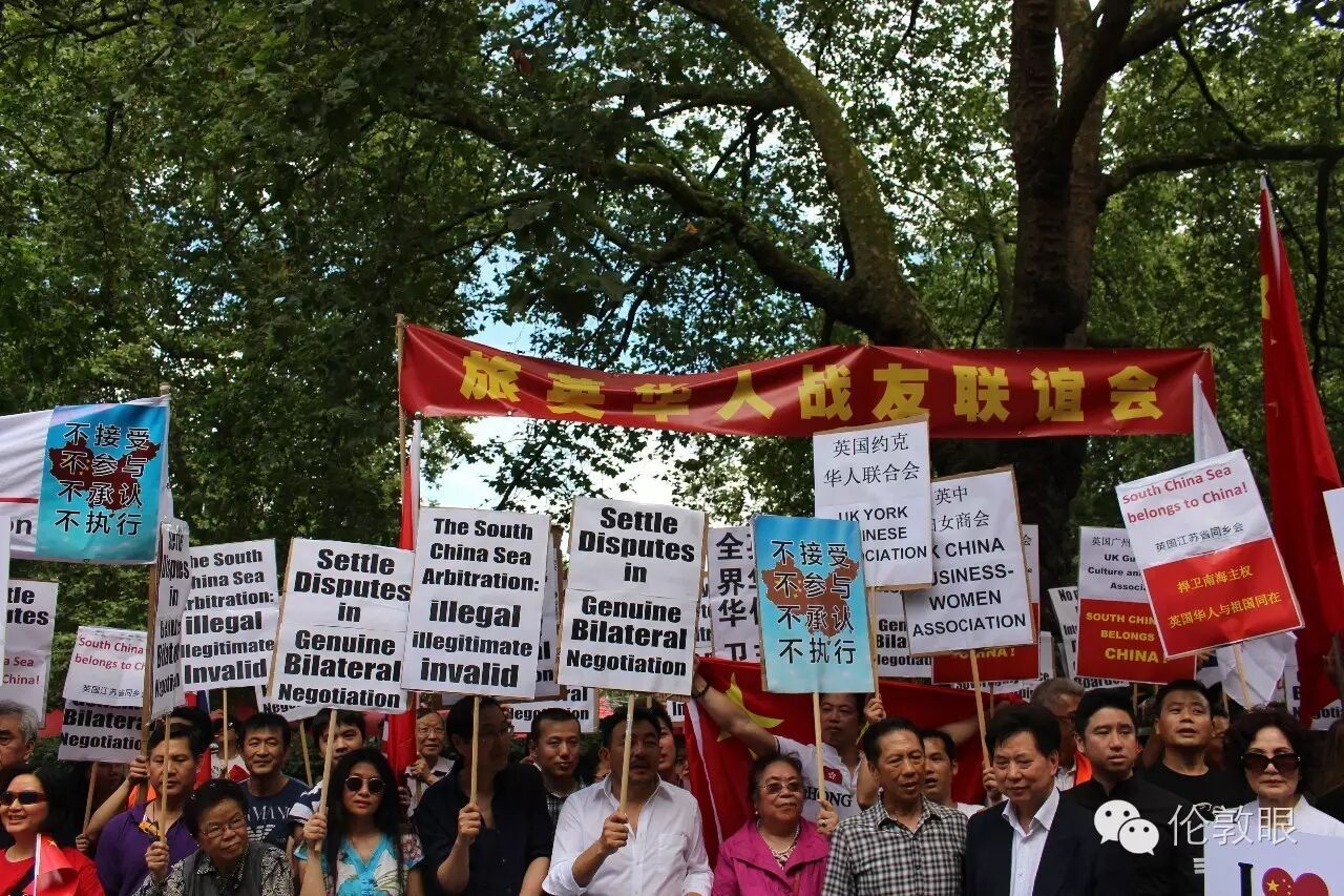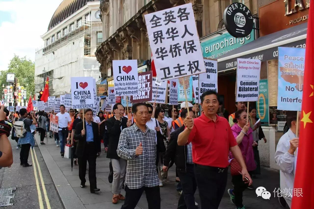 7月16日下午,为了抗议海牙仲裁庭的非法仲裁和捍卫中国在南海的固有主权,伦敦华埠商会组织英国50多个华人社团发起示威游行。
