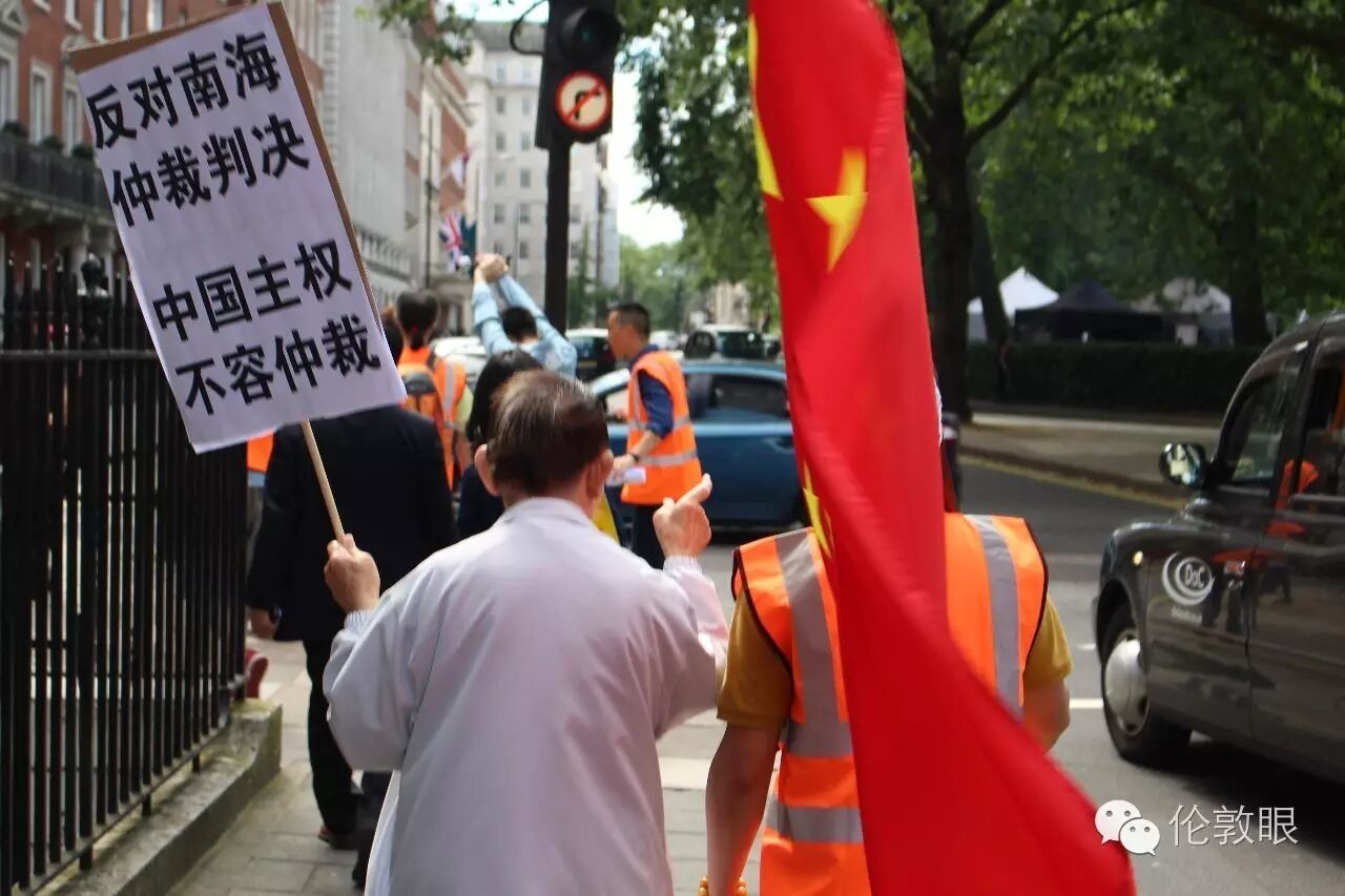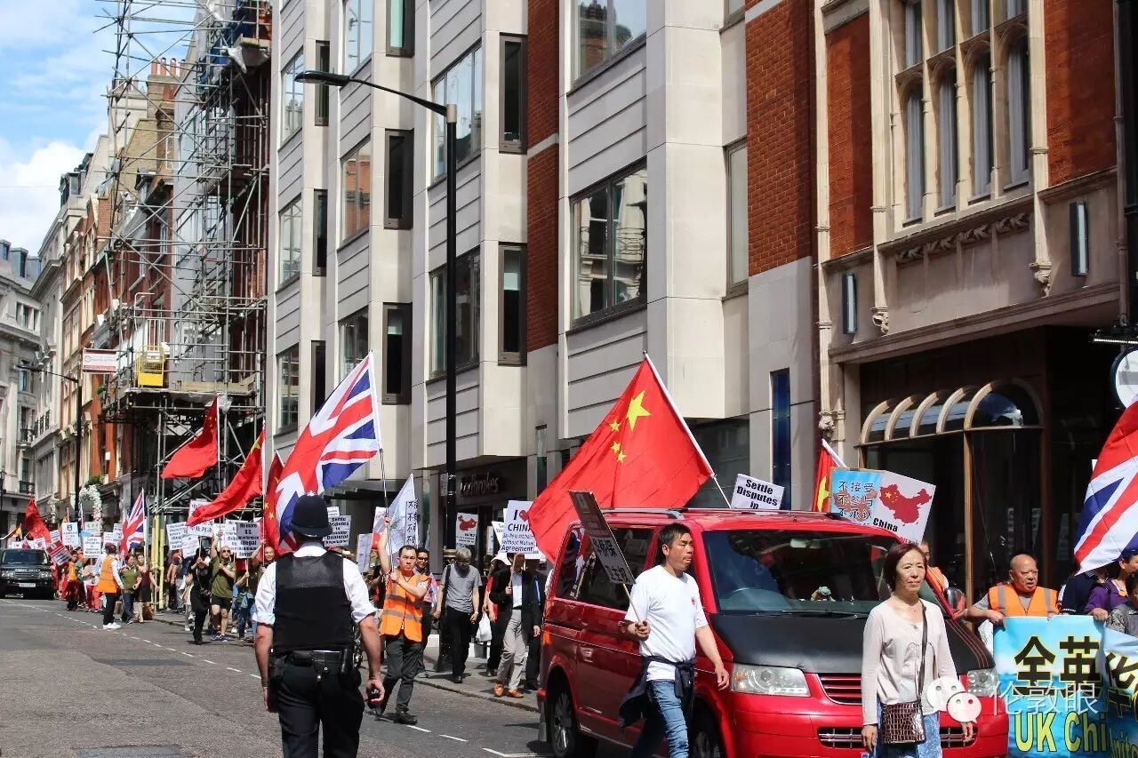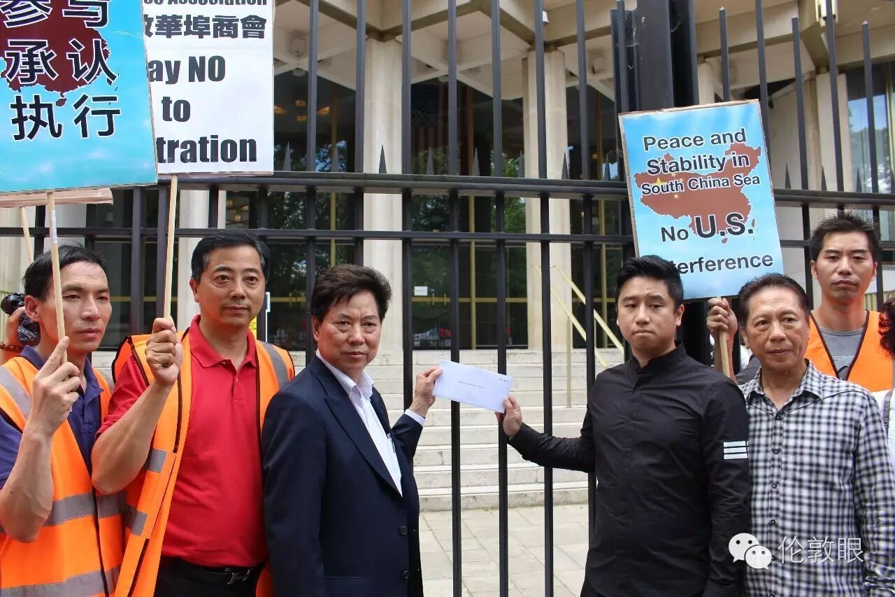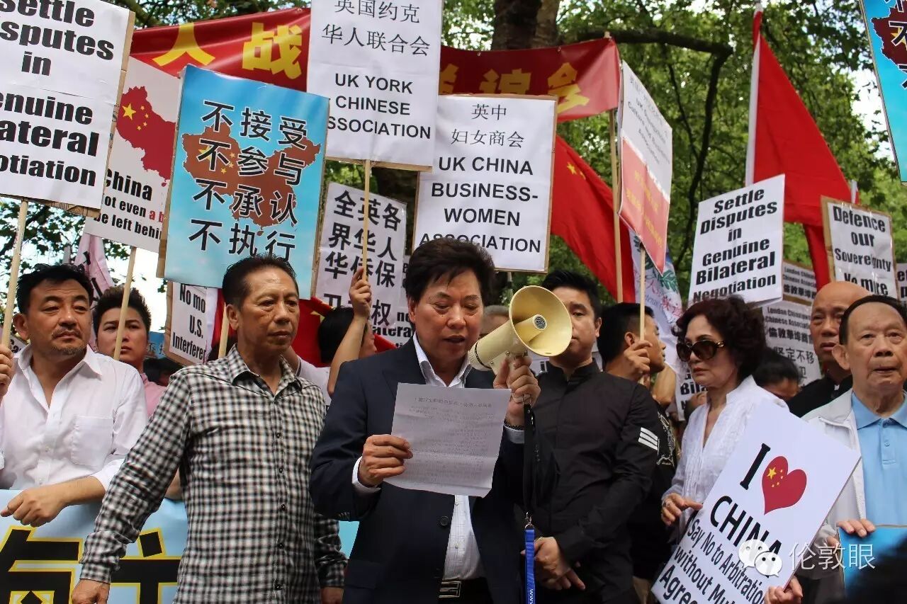 7月16日下午,为了抗议海牙仲裁庭的非法仲裁和捍卫中国在南海的固有主权,伦敦华埠商会组织英国50多个华人社团发起示威游行。