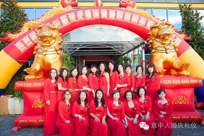 身着红妆的夫人团们合影,俨然一道靓丽的风景线