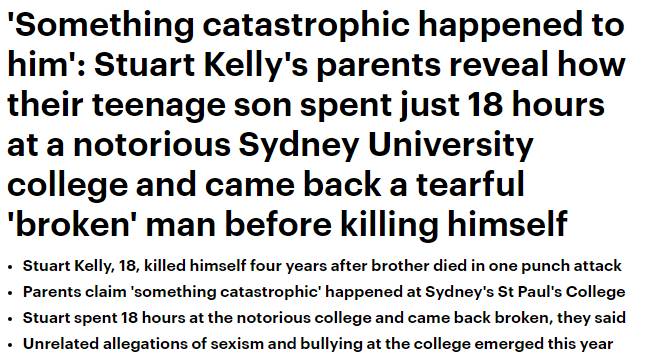 Stuart自杀后,所有的矛头都指向了「悉尼大学圣保罗学院」,无数人对圣保罗学院感到深深地失望,纷纷指责学院失职,